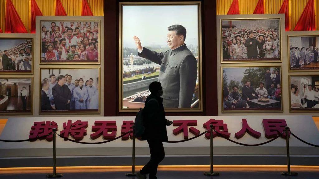 2021 年 11 月 12 日,北京;中国共产党博物馆,一位参观者在北京中国共产党博物馆习近平的照片和“我将没有自我,不辜负人民”的口号下经过。刚刚结束的中共16中全会显示,习近平比以往任何时候都更加牢牢地掌握权力。 AP – Ng Han Guan