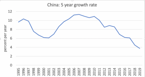背景提示:邓小平在上世纪70年代末推行的改革创造了经济奇迹。曾经极度贫困的中国如今是一个中等收入国家,鉴于其人口规模,这足以使其成为一个经济超级大国。但中国的经济增长一直在逐渐放缓。这是中国经济增长率的五年移动平均值: