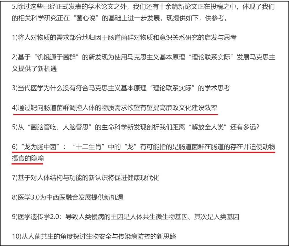 在另一篇论文中,该作者还宣称自己发现了“龙即菌之肠”的秘密,认为“十二生肖中的龙有可能指的是肠道菌群在肠道摄食的隐喻”(载于该作者科学网博客)。