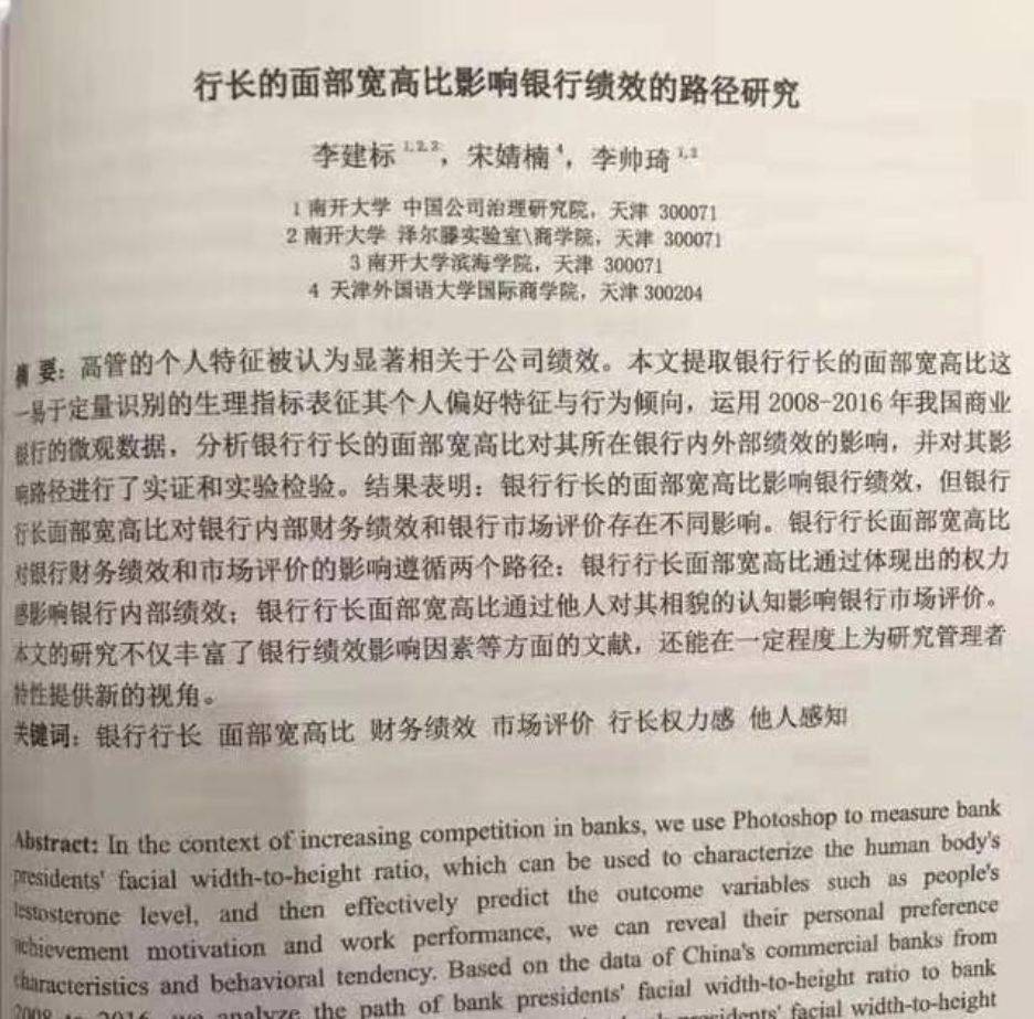 这篇论文的标题叫做《行长的面部宽高比影响银行绩效的路径研究》,在2018年的中文互联网上大火了一番。论文第一作者为南开大学教授,第二、第三作者分别为天津外国语大学在读硕士、南开大学在读博士。