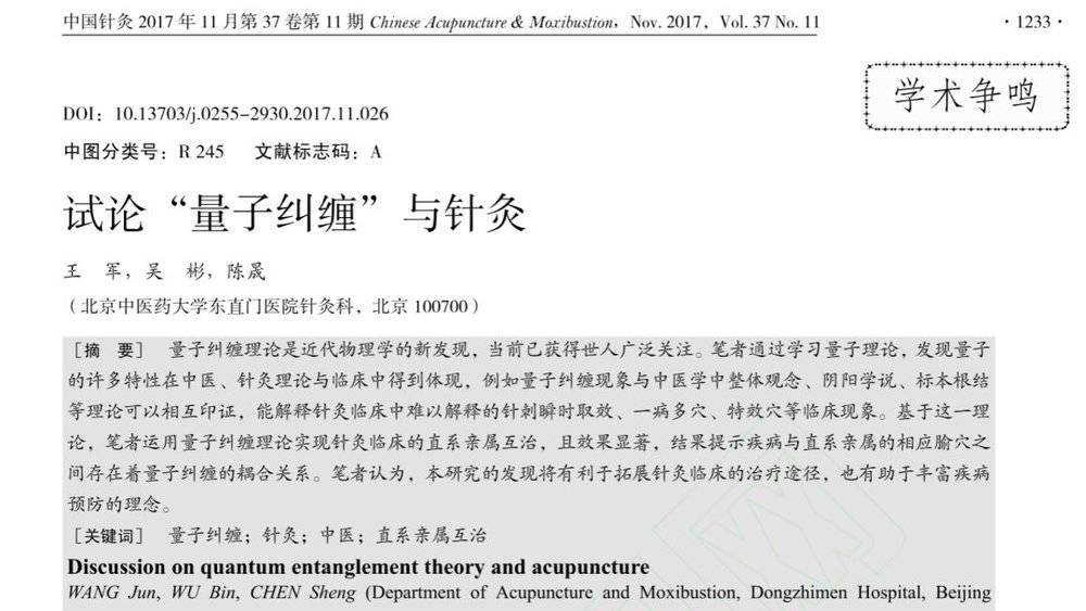 论文告诉我们,量子物理学与中医学可以完美接榫,“量子物理学不断发展的研究成果,与中医学的整体观是相符的”,将量子物理学应用在医学上,可以实现“直系亲属针灸互治”: