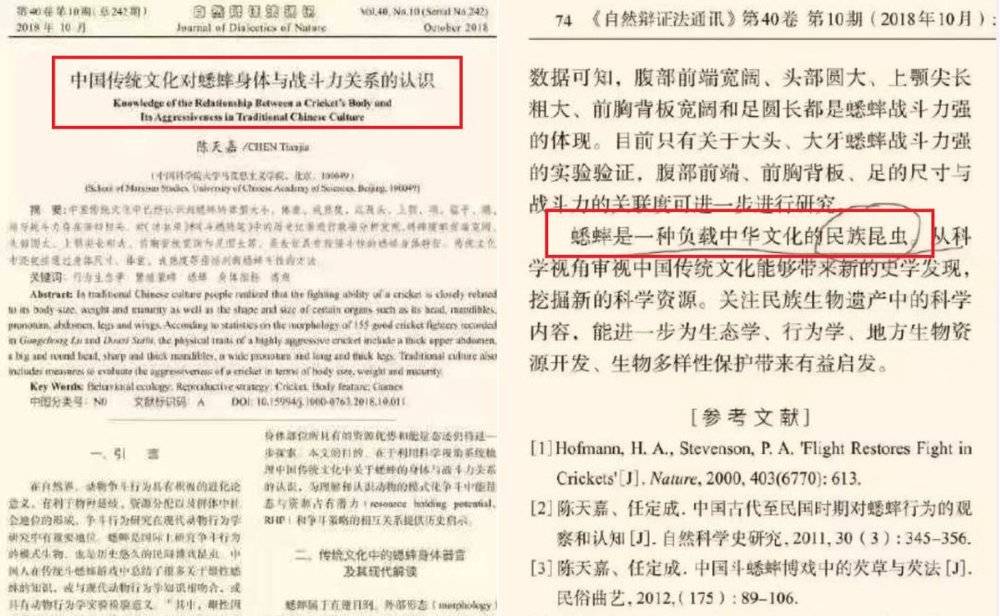 2018年还有一篇题为《中国传统文化对蟋蟀身体与战斗力关系的认识》的论文饱受网友吐槽。该论文刊登在核心期刊《自然辩证法通讯》中,文章主旨是“利用科学视角系统梳理中国传统文化中关于蟋蟀的身体与战斗力关系的认知”。
