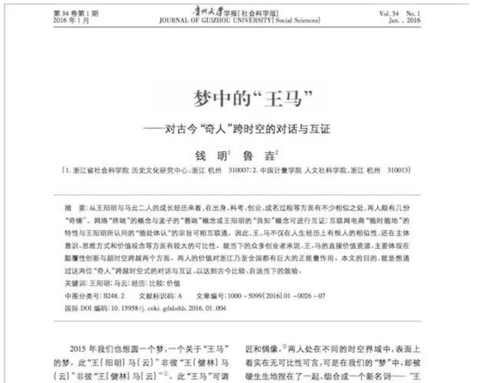 该结论出自浙江社科院某教授的论文《梦中的‘王马’——对古今‘奇人’的对话与互证》(“对”字前疑似少了一个“一”字),刊登于2016年第1期的《贵州大学学报》。