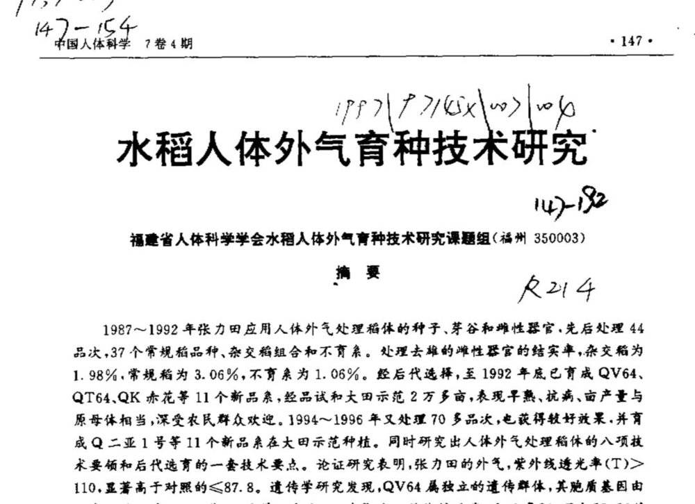 在论文《水稻人体外气育种技术研究》中,作者“研究”认为,“外气”不但能作用于人体,同样也能作用在植物身上,向水稻发送“外气”,搞“外气育种”,可以使水稻“产生遗传变异,获得新的生命体”,“具有快速、简易经济、高效的特点,是育种学领域的新创举”。