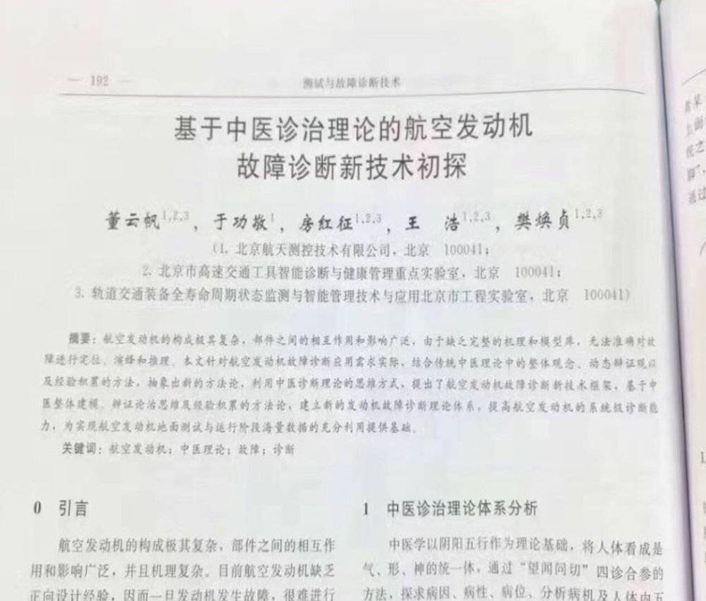 比如下面这篇2018年爆红网络的论文《基于中医诊治理论的航空发动机故障诊断新技术初探》,实在是可谓“究天人之际,通古今之变”。