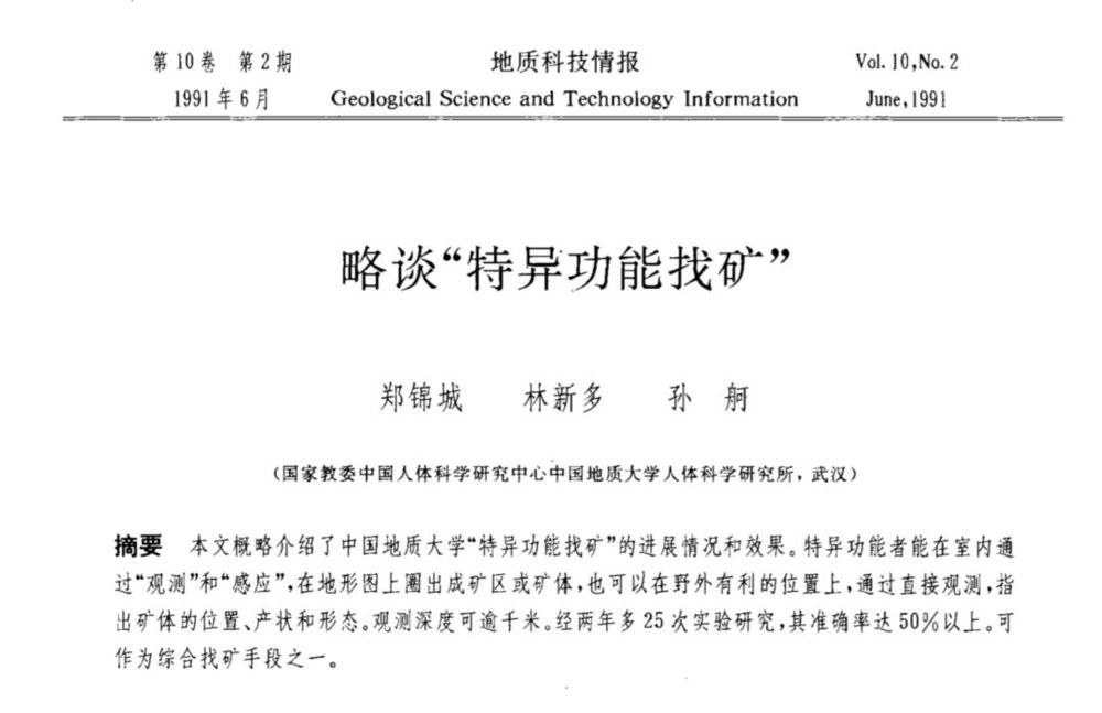 《略谈“特异功能找矿”》一文的作者之一孙×,自认具有“脑中成像”的特异功能,可用于矿藏勘探,于1988年被中国地质矿产部免试特招进入中国地质大学(武汉)地质矿产系,后就职于中国地质大学人体科学研究所(北京),从事“用特异功能找矿”(诗人海子迷恋气功也与之有关)。论文声称,他们通过“20多次实验”,已经证实“特异功能找矿”可行,且具有速度快、省人力物力的优点,且预言道: