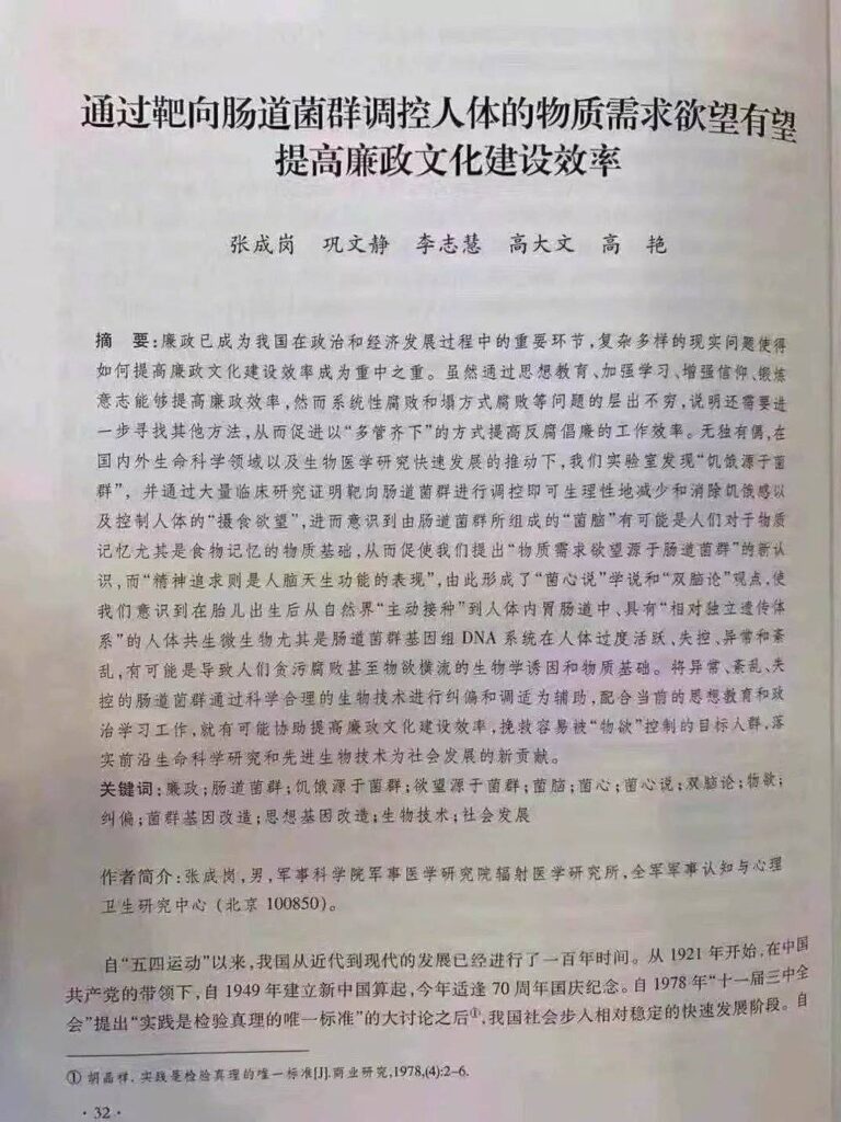 意即,一个人走向了贪污腐败,原因之一很可能是他体内的肠道菌群出现了问题。据此,论文建议对这些出了问题的肠道菌群“通过科学合理的生物技术进行纠偏和调适”,进而“协助提高廉政文化建设效率,挽救容易被‘物欲’控制的目标人群”。