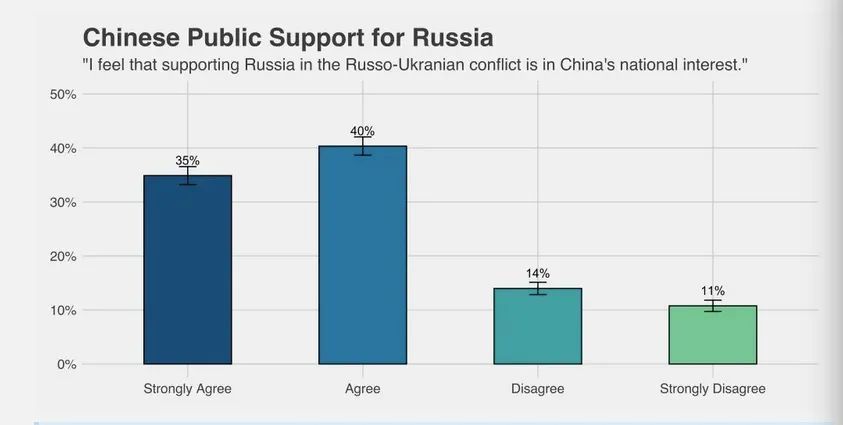 这是辛辣的嘲讽,但却未必是事实。卡特中心今年4月初的一项调查显示,75%的中国人都支持俄罗斯,这一比例几乎和俄罗斯本国差不多——卡内基国际和平基金的研究发现,俄罗斯国内支持/反对这场战争约为7:2,剩下近10%不置可否。