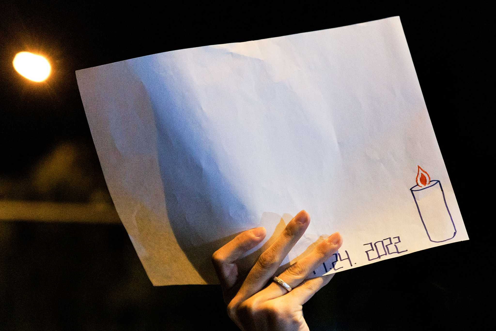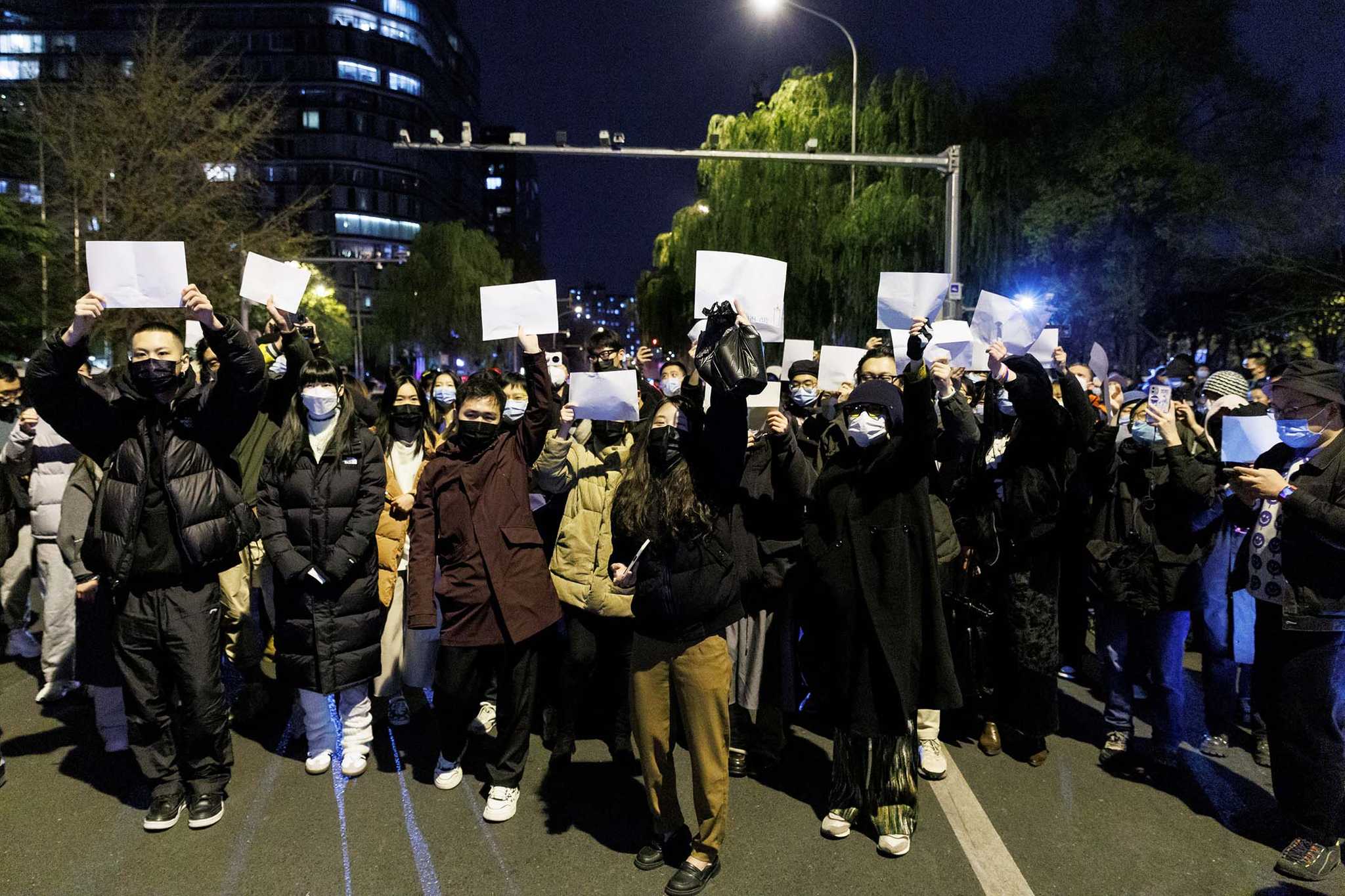 2022年11月27日,北京,乌鲁木齐火灾遇难者纪念活动期间,人们聚集在一起守夜并举著白纸抗议。摄:Thomas Peter/Reuters/达志影像