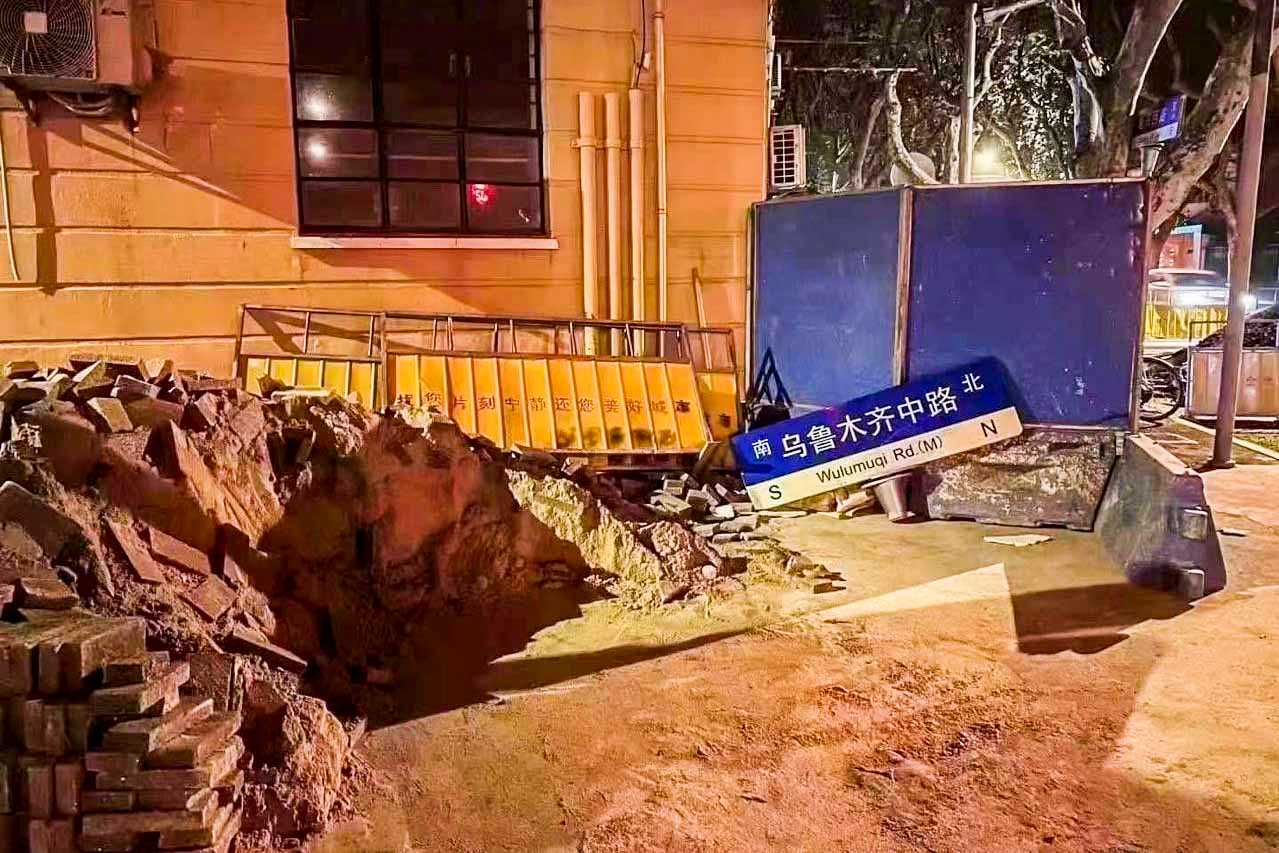 2022年11月27日,曾聚集大量悼念市民的上海乌鲁木齐中路,路牌被拆掉放在地上。网上图片