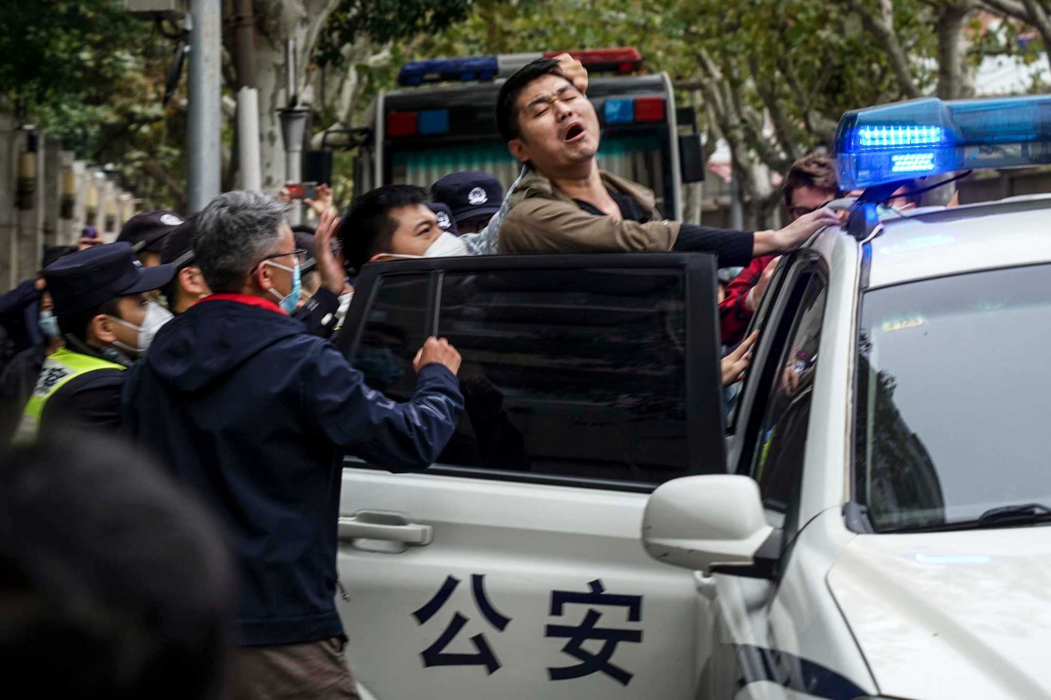 2022年11月27日,上海的示威现场,一名示威者被警察逮捕并被押上警车。摄:AP/达志影像