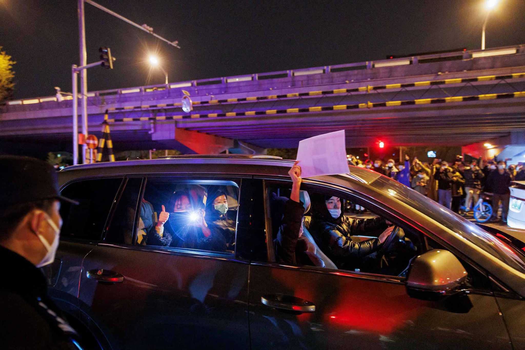2022年11月28日,北京,为乌鲁木齐火灾受害者守夜后的集会上,一名车内的人拿著一张白纸抗议。摄:Thomas Peter/Reuters/达志影像