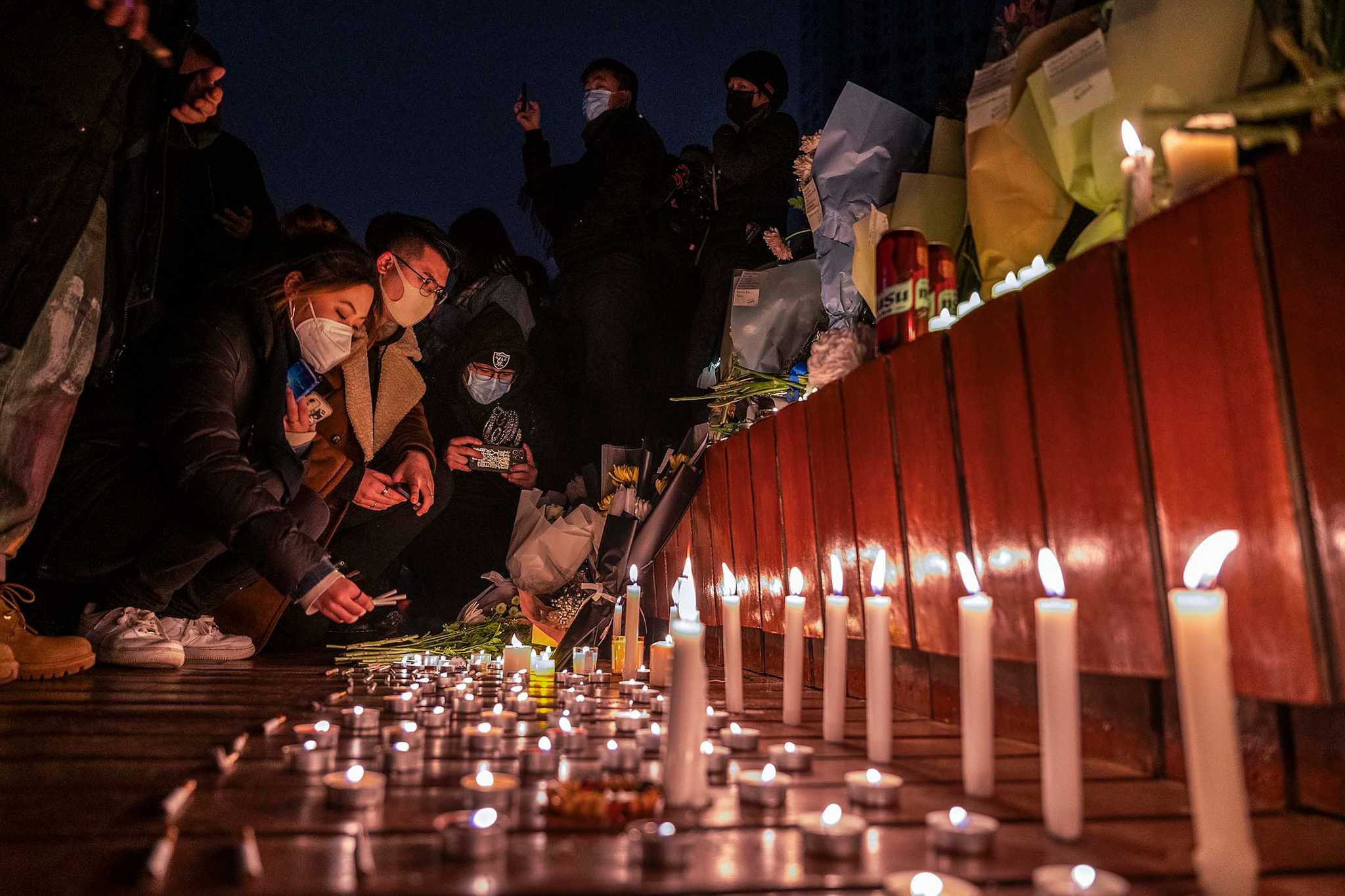 2022年11月27日,北京,为悼念乌鲁木齐大火死难者,市民在追悼期间点燃蜡烛。摄:Kevin Frayer/Getty Images