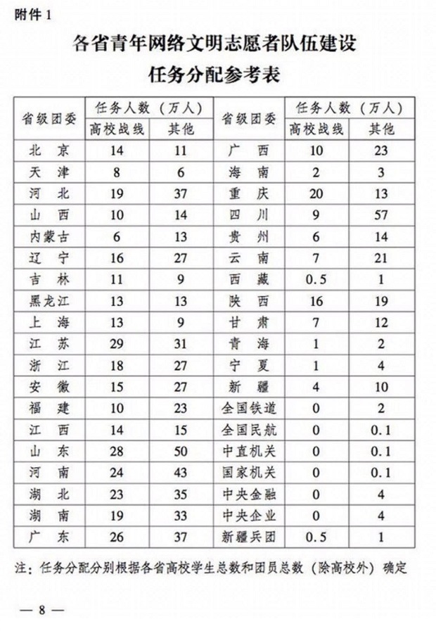 根據文件,各主要省市都要招募數以萬計的「青年網絡文明志願者」,單是北京,高校和其他單位就要招納合共25萬的青年網軍;在各省市之中,山東的名額最多,合共有78萬之譜;其次是河南,要招67萬人;四川也要招66萬。