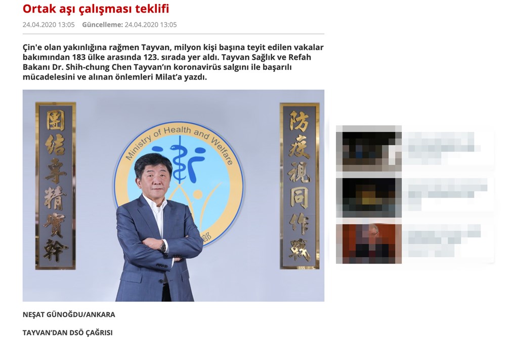 紀元報24日在網路版同步刊登陳時中專文,內容分享台灣成功防疫經驗與採取的措施,並且提議共同研發疫苗(圖取自紀元報網頁milatgazetesi.com)