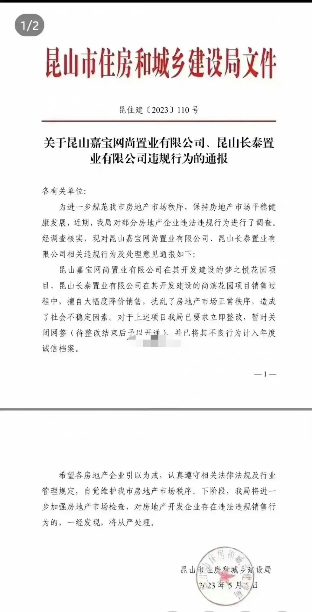 昆山市某房地产擅自大幅度降价,被住建局认定为扰乱房地产市场正常秩序,造成社会不稳定因素,要求立即整改。