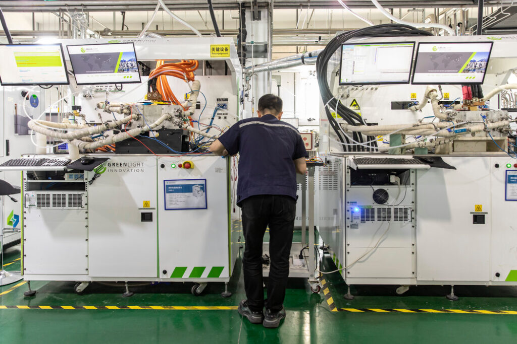 “过去一个人负责一台机器,现在一个人可以管两台,”总经理戴威在走过一排组装燃料电池的机器时说。“下个月,一个机器人就可以管六台了。”