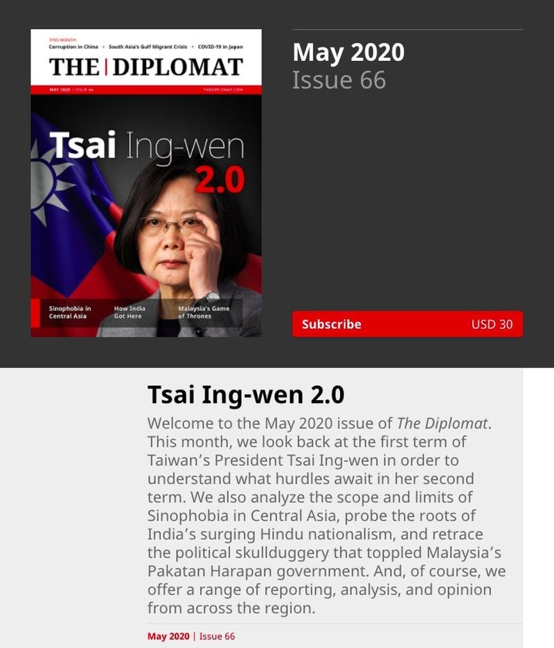 台灣520總統就職典禮將至,總統蔡英文再度揚威國際。繼CNN、《時代》雜誌後,蔡英文再登上美國著名線上時事雜誌《外交家》(The Diplomat)5月最新一期的封面人物,背景更襯上青天白日滿地紅旗。報道除回顧蔡在首個任期的工作重點外,也探討她連任後將面對的種種挑戰。