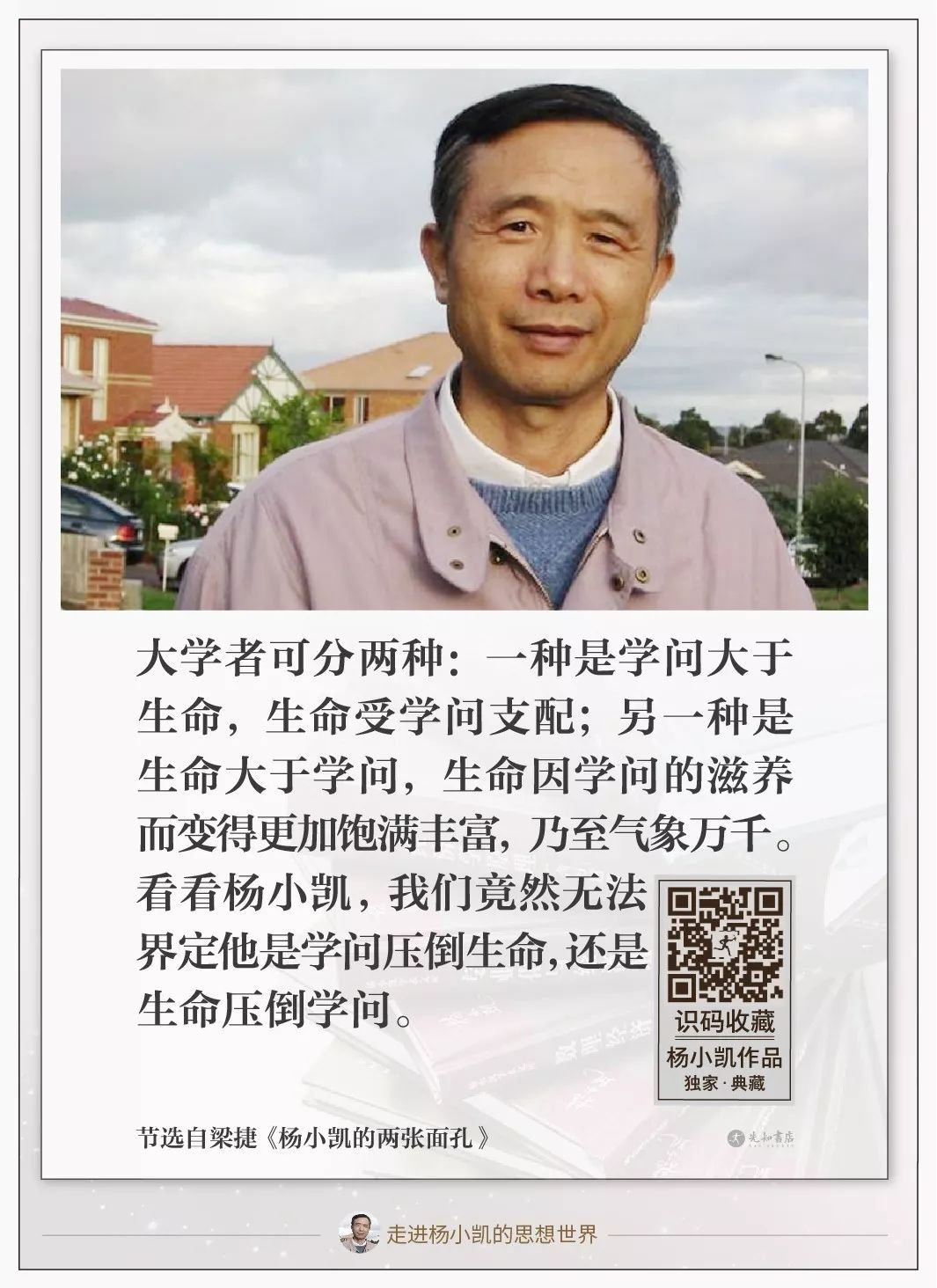 然而,梁捷在《杨小凯的两张面孔》一文中,却道出了原委:小凯一生,只关注大问题,大学问。他选择经济学,也正因为怀揣中国发展的大问题。他不愿像多数经济学家那样摆弄一些饾仃琐屑的学问,他执着于数学技巧,就是要竖起新兴古典的大旗,重新阐述经济学思想。以此求解“中国向何处去”这个萦绕他一生的问题。