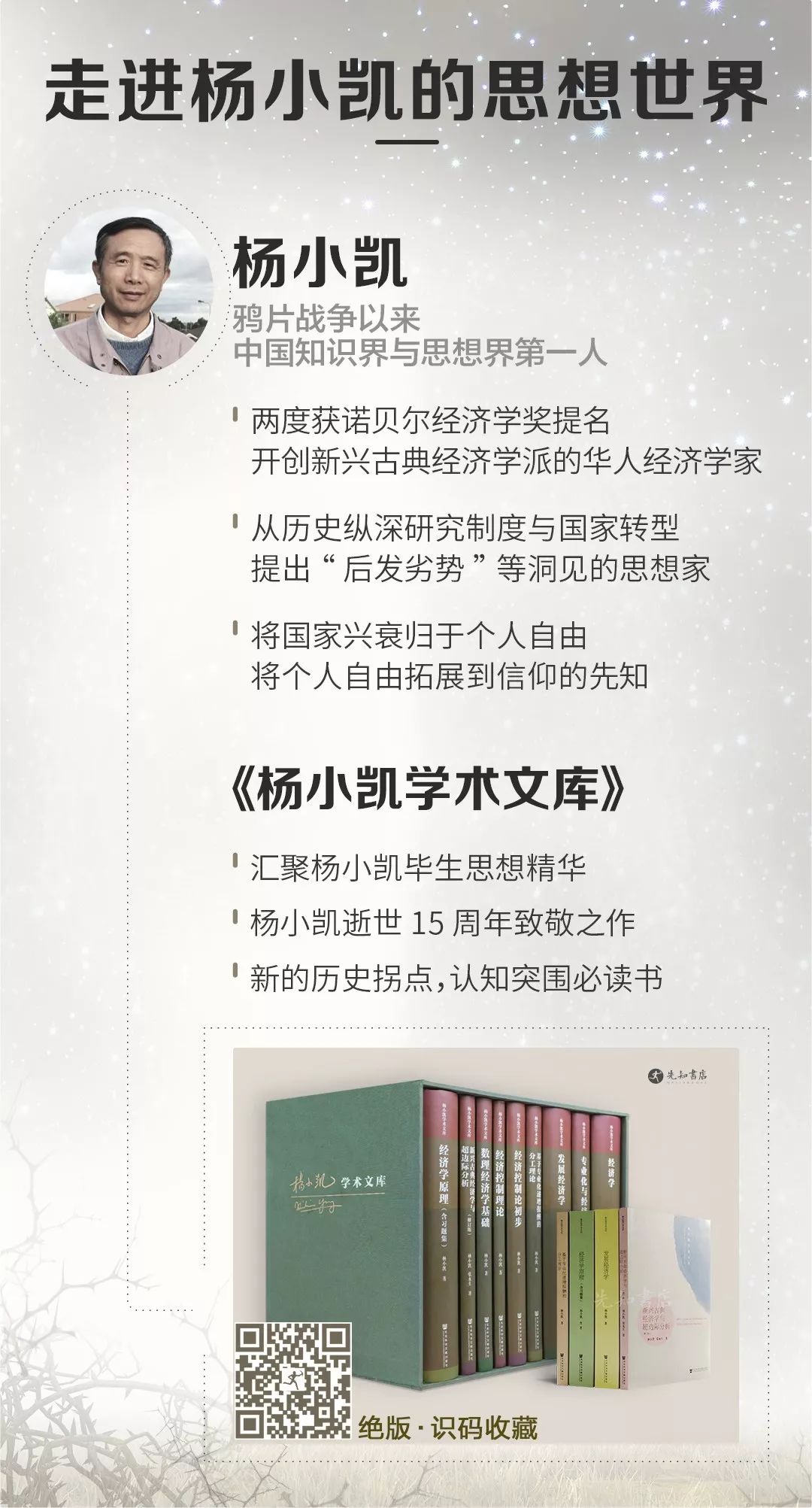 思想关怀——作为思想家的杨小凯,视英美保守主义为西方文明的定海神针,并提出“信仰是制度第一因”的洞见。(因篇幅所限此处不展开,请阅读《向死而生:杨小凯和他的三次范式革命》,一窥全貌)