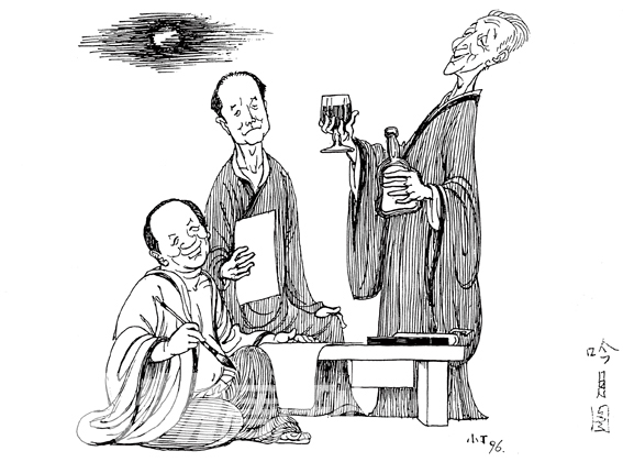 丁聪1996年为《三家诗》绘《吟月图》漫画像:左起黄苗子、邵燕祥、杨宪益