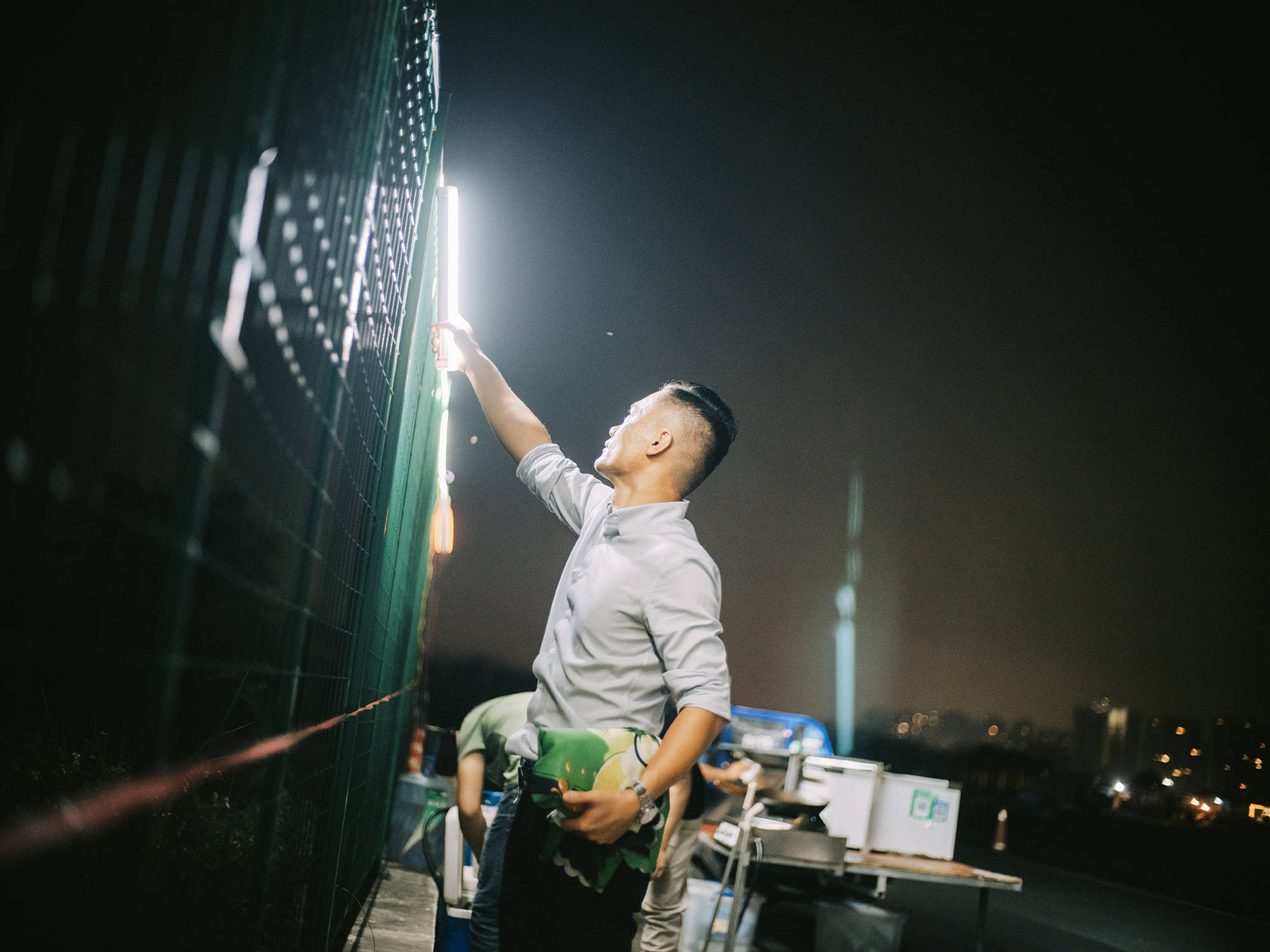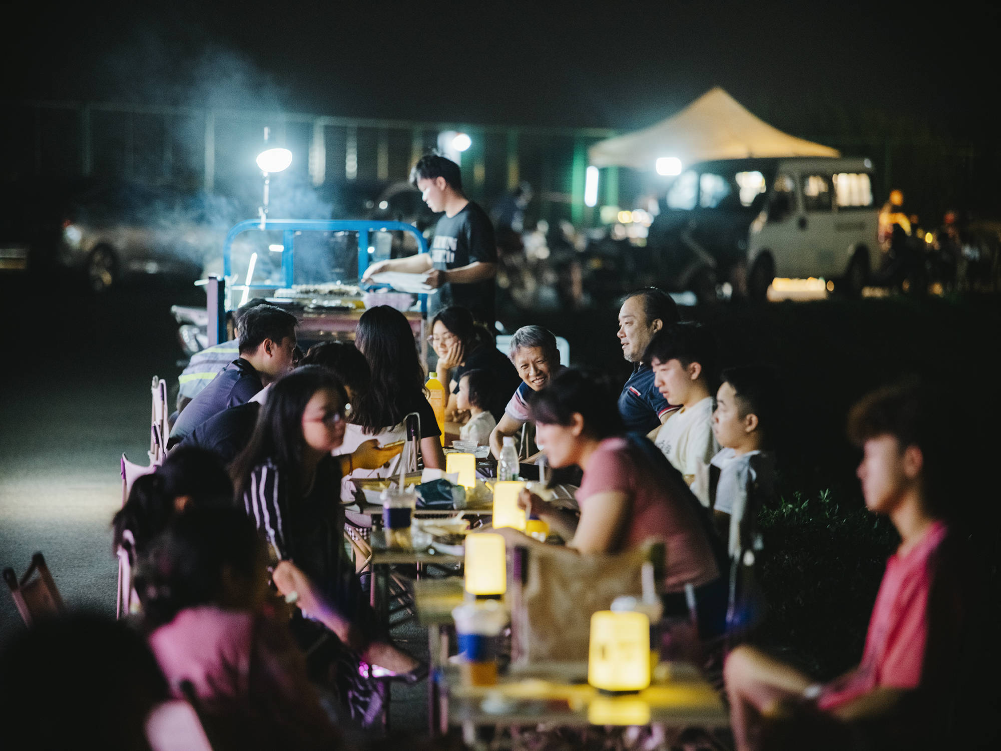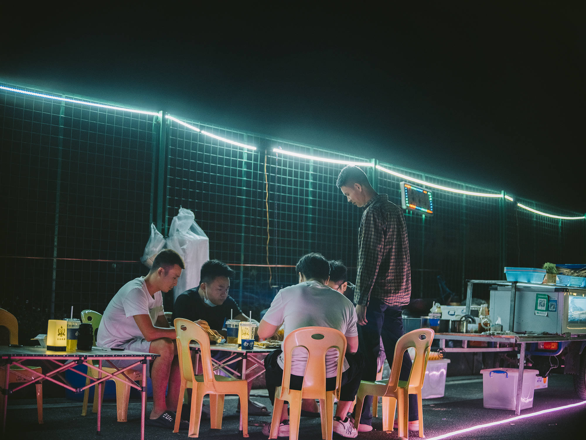夜市上,阿贵和梁建东一起招揽生意。顾客来吃炒粉,阿贵会推荐他们再来杯柠檬茶。阿贵来不及收拾桌子,梁建东会帮他收,给下一波客人留位置。10月初,阿文也加入了他们,烤生蚝。相比其他生意,生蚝买回来开壳,冲洗,就可以拿去烤,省去了前期准备时间。每天从中介公司下班后,他可以直接来摆摊。