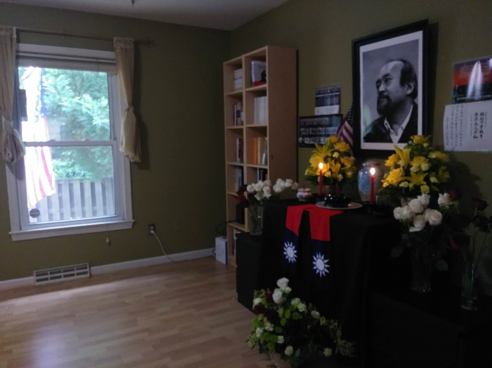 照顧他的友人已經一一離去。兩天前那個暴雨如注、雷聲大作,閃電刺眼的時節,我來到屋瓦透濕、台階積水的他的居所“結盧”,為我們這位兄弟守靈。間或有友人送來鮮花,靈臺花叢上,他眼睛望著窗外。窗外,那面來自國會、象徵自由的旗幟還在!唯有在這時,盯住照片裡那兩隻閃爍光亮的眼睛,才能意識到,那個飄走的靈魂,是真的。