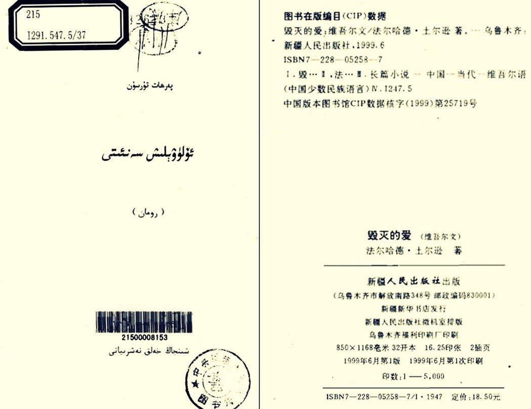 帕尔哈提1999年出版的长篇小说《自杀的艺术》,因为书名涉及敏感字词,而被出版社更改译名《毁灭的爱》,作者的译名也稍有不同。如今这本书已经几乎从中国的出版市场上绝迹;同时,新疆人民出版社的线上书目,也已找不到任何维吾尔文的书籍资讯。 图/作者Kita翻摄提供