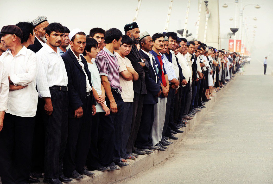 “他说我们看起来都长得像彼此。”图为2008年8月7日在新疆喀什,当地维吾尔人被要求排成一列,追悼遭到维吾尔人袭击丧命的武警。 图/法新社