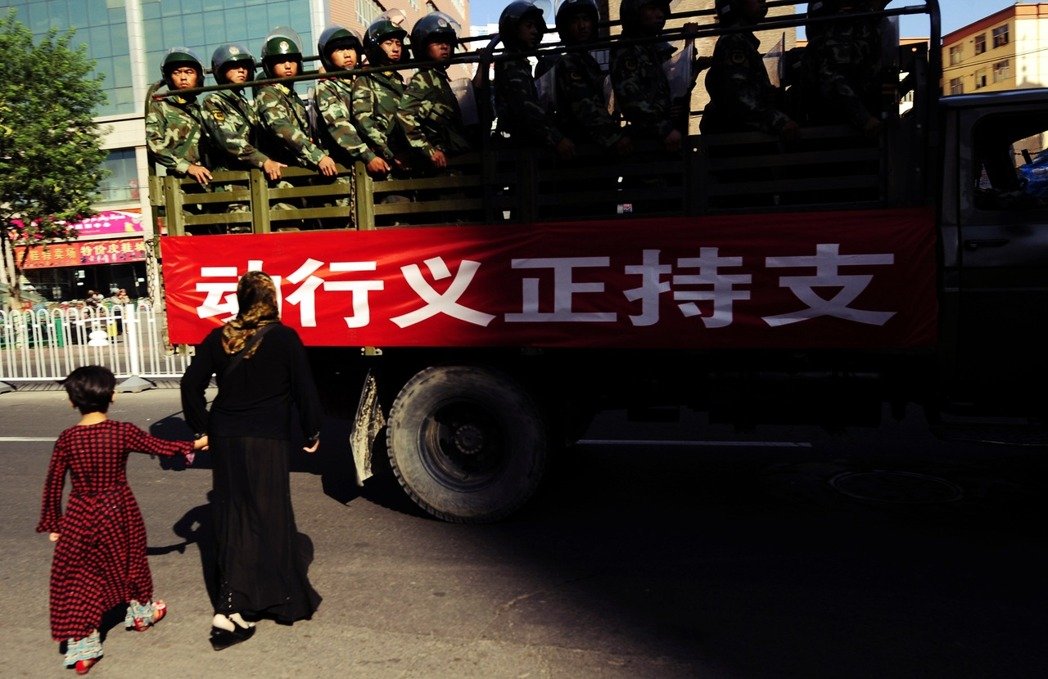人们被视为一个模糊交叠的整体,被视为罪犯、强制送入拘留营体系,而后被分派至工厂,或获罪转入监狱。图为新疆的镇暴警察。 图/法新社
