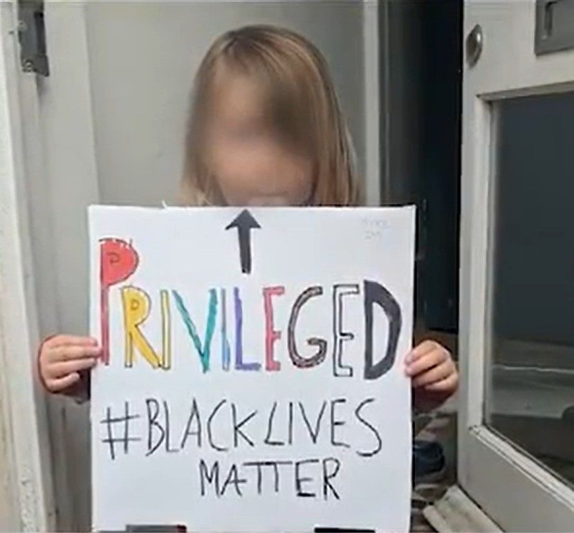 所以很多家长对这些言论不满,当然就可以理解了,这些言论太疯狂,本质上都是另一种种族主义言辞,他们成为一种同盟,而其他的任何人都不是他们的朋友。英国的情况同样不容乐观,那里的一位母亲近期在twitter上发了一张她女儿的照片,画面上小孩女孩跪在地上,拿着一块牌子,上面有个箭头指向自己,写着“特权”。(以此暗示她在忏悔自己所获得的特权和黑人所遭受的不公)