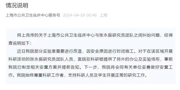 上海公卫中心声明称,要对部分实验室进行改造升级,已妥善安排张永振他和研究团队搬到其它实验室,又因为安全原因必须封闭施工,所以才不让人进入。