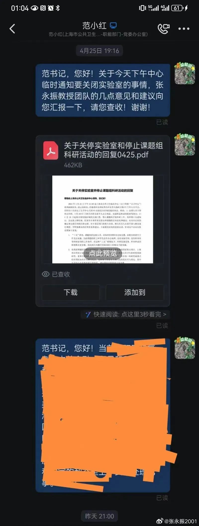 而根据张永振老师的说法,上海公卫中心用1分钟时间通知了他P3实验室改造的决定,勒令团队在2天内搬离,却不允许任何人进去拿走私人物品,也没有让团队参与搬迁实验样品。