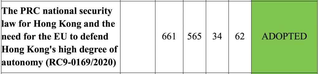 該項無約束力動議得到歐洲議會中三大黨的代表提出,措辭強硬譴責中國單方面在港推行國家安全法,破壞香港自治、法治、基本人權,違反中國在國際法、尤其是《中英聯合聲明》下的承諾,及譴責中國加劇干預香港內部事務,要求中方停止逼商界表態支持國安法。