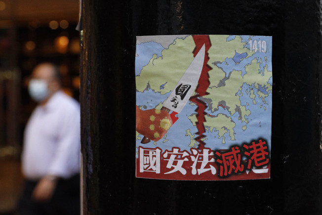 圖為抗議者在香港街道上張貼一張反國安法的文宣。美聯社