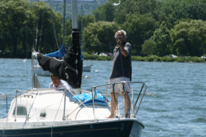 某日,读完炮兵团在泥泞中强行开进一节,去卡尤加湖驶帆、游泳。到湖心,一平操纵船,我和周琳下水。时值盛夏,湖水温凉宜人。游得兴起,便想朝岸边游。周琳劝止,说太远了。我说你不是每年都参加横渡吗?从湖心游上岸,不过是横渡的一半。周琳又说,万一风停了,汽油也没了……还是不要游那么远。又绕船游了两圈,想换一方位往康奈尔大学钟塔游。周琳挥臂追上来,麻利矫健,苦言相劝:望山跑死马,还是太远。一平一个人在船上,控制帆没绝对把握。——听话听音,总之是觉得我老了。忆年轻时,游长江120里,中年和北明游漓江40里,只能一笑,收拾起万丈雄心。又游了一阵儿,上船。爬舷梯时,两腿及腹肌几乎抽筋。周琳关照得对,到底是老了。周琳上船,夫妻俩配合驶帆,那船便吃满了风倾斜着破浪前进。一平把舵柄交我,料理带来的煮玉米、烤排骨和红葡萄酒。蓝天白云,舷边哗哗有水声。我感慨道,景色如诗如画,可惜无福消受了……今儿整个是一笑话:往对岸游,怕湖上没风,帆船追不上;往康奈尔游,一平开船追,把汽油耗光了也没追上。夫妻俩都笑,一平说,记得咱俩游密西西比河,也只有一两公里吧,还是顺流而下……是不是真老了……