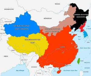您看,这就是地图。我刚画的:中国,满洲国在这儿。如果我们说,被中共占领地区中,有独立或复国诉求的——满洲国、南蒙古、维吾尔地区、西藏(西藏更不用讲了,它有流亡政府、流亡议会,是一个完整的流亡国家形态),然后下面是香港。
