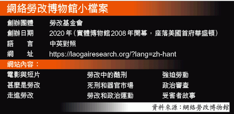 鞭撻中共勞改制度的勞改博物館正式上線。網上版除了將實體版博物館的資料放上網外,更有大量博物館沒有收錄資料,包括60部與勞改相關的電影或短片、超過500多份的文獻,受害者名單亦增加至150人,全部有聲有畫有真相,館方形容是「世界上第一個系統揭露中共罪惡的博物館」。未來他們銳意收錄更多偏遠不為人知的政治犯,建立數據庫,希望做到「為無名無聞無聲的人發聲」。