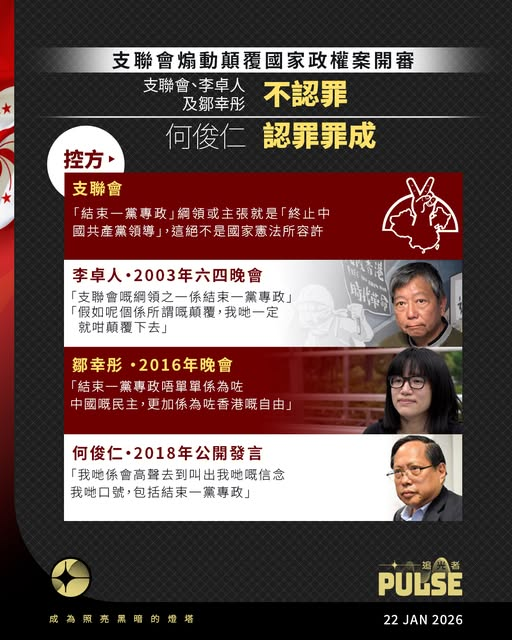 支联会煽动颠覆国家政权案今(22日)开审,案中第3被告何俊仁认罪被法庭接纳并裁定罪名成立;其余被告包括支联会、李卓人及邹幸彤不认罪,预计审讯要75日。