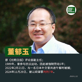 (维权网信息中心报道)2026年2月21日,本网获悉:获刑7年的原《光明日报》评论部副主任董郁玉已入狱4年整。原《光明日报》评论部副主任董郁玉在四年前的今天被捕,后被以间谍罪判刑7年。
