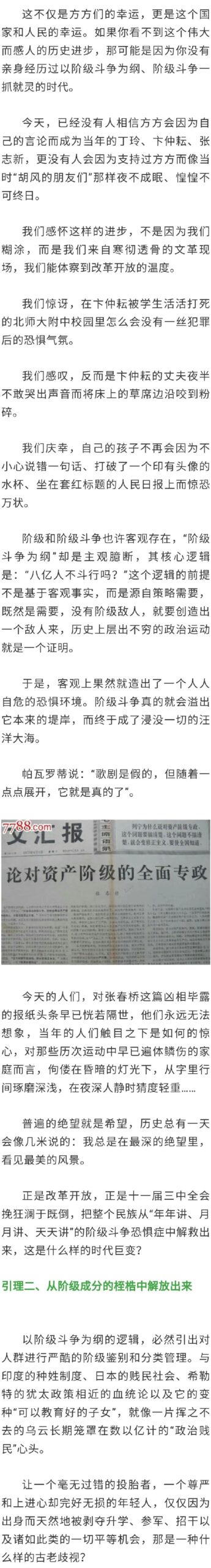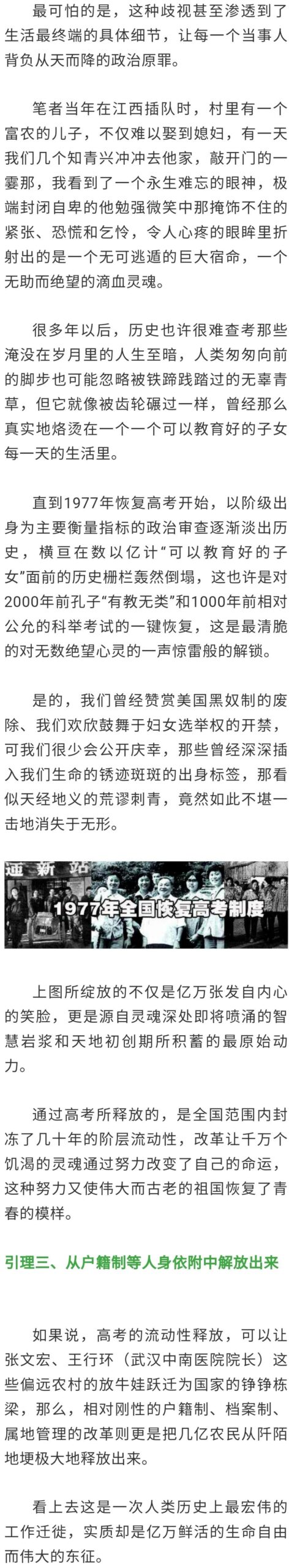 表面上,改革开放前,特别是四人帮时期,严格的户籍制、属地制、档案制、是对几亿农民自由迁徙的空间制约,但归根结底,是对人类自由本质的系统性、体制性侵夺。只有在这个维度上,才能更深刻地感知改革开放的解放意义,它所释放的不仅是整个国家经济建设最深厚的人口红利,更是整个中华民族最长远的精神红利。