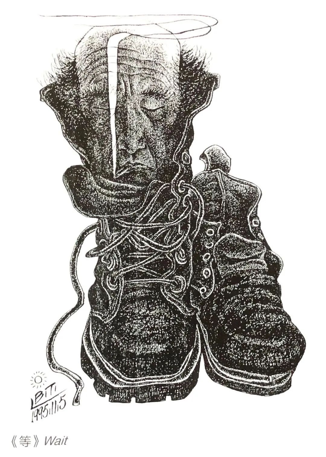 艺术的自由,为什么要在靴子里等待?“鞋子暗示着生存处境的狭小。等,不就是改变处境吗?鞋子既狭小,又臭烘烘的,就是希望改变这种处境。”李保田的靴子,是一个充满了忧虑、恐惧和禁锢的靴子。存在主义认为,人只有在忧虑、恐惧状态中,才能领悟真实的存在。李保田躲在荒诞的靴子里,寻找美和艺术的自由,寻找自我的存在。或许我们可以认为,李保田的靴子,是存在主义的靴子。存在主义的最著名的靴子,是梵高的靴子。据说梵高一生画过8双靴子,其中一双,被海德格尔认定来自一位农妇:满溢出劳动步履的艰辛,田垄上的缓慢步伐的坚韧,沾着土地的湿润和肥沃,大地对成熟谷物的宁静馈赠以及冬日田野荒芜的休耕期里大地未经明言的自我拒绝,对面包的可靠性的无怨无艾的渴望,分娩来临时的哆嗦以及死亡逼近时的战栗……梵高的靴子“属于大地并且在农妇的世界里得到庇护。”(海德格尔)而李保田的靴子隐喻了一个没有“自我选择和自我控制的自由”的荒诞的世界。他用靴子里的等待,对存在主义哲学,做了美学的诠释。作为存在主义的创始人,海德格尔如果看到了李保田的靴子,会有怎样的感想?
