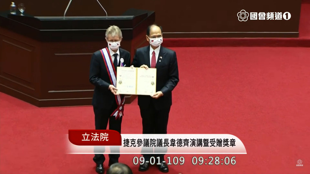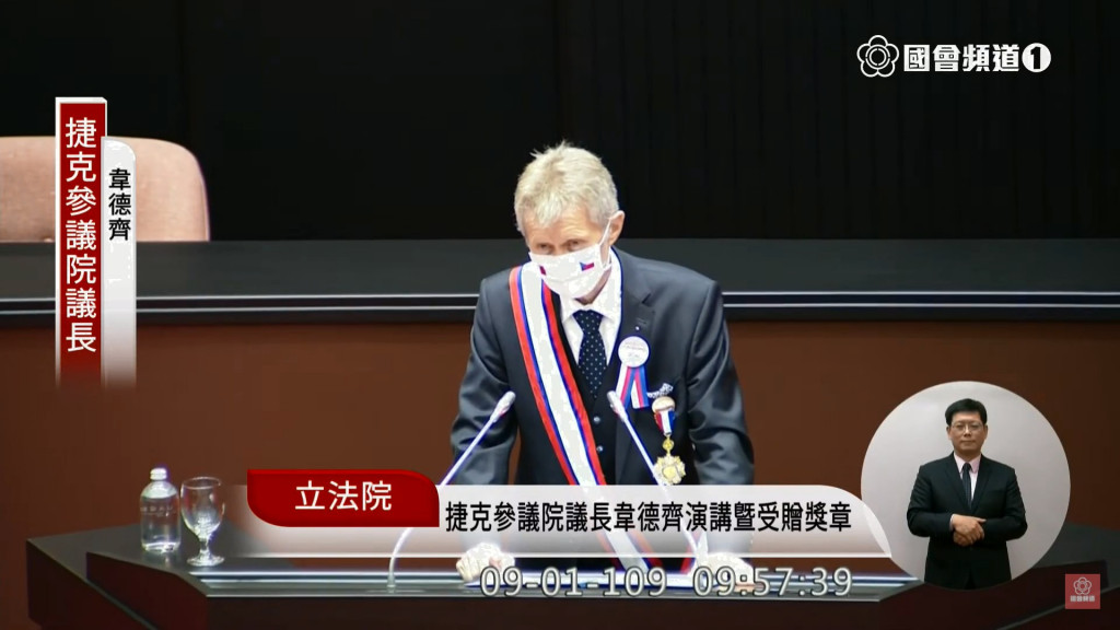 捷克參議院議長韋德齊(Miloš Vystrčil)2020.9.1率團訪問立法院,受贈獎章並舉行演說。圖/擷自國會頻道