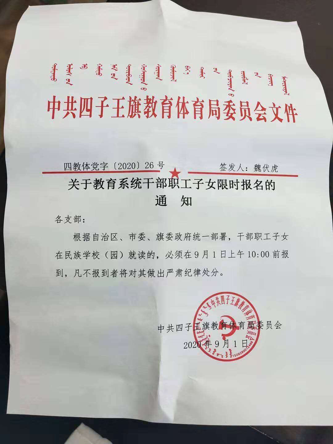 9月1日,內蒙四王子旗教育體育局委員會緊急發文,稱根據自治區、市委、旗委統一部署,幹部職工子女凡在民族學校就讀的,9月1日必須到校報到。凡是不報到的,將面臨「嚴肅紀律處分」。
