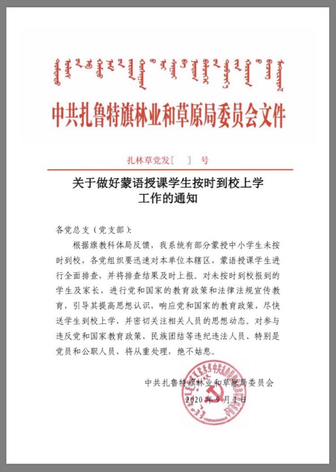 另有扎魯特旗林業和草原局委員會9月1日發布通知,要求各黨支部迅速對各單位轄區,蒙語授課學生進行全面排查,並將檢查結果及時上報。