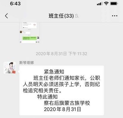 另有察右後旗蒙古族學校班主任8月31日發布緊急通知給家長,要求公職人員9月1日必須送孩子上學,否則追究相關責任。