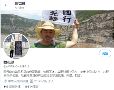 戴宗言:1972年1月9日出生,网名“戴克健”,云南省曲靖市人,曲靖市马龙县盛程源建筑有限公司第三工程处经理,“讨债中国行”当事人,数万粉丝拥有者,知名维权网民,人权捍卫者,中国在押维权人士。