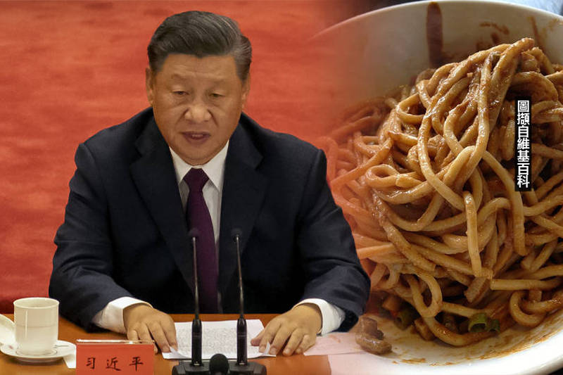 習近平8日講稿,突然說出「全國人民都為熱乾麵加油」。(本報合成)習近平8日講稿,突然說出「全國人民都為熱乾麵加油」。(本報合成)