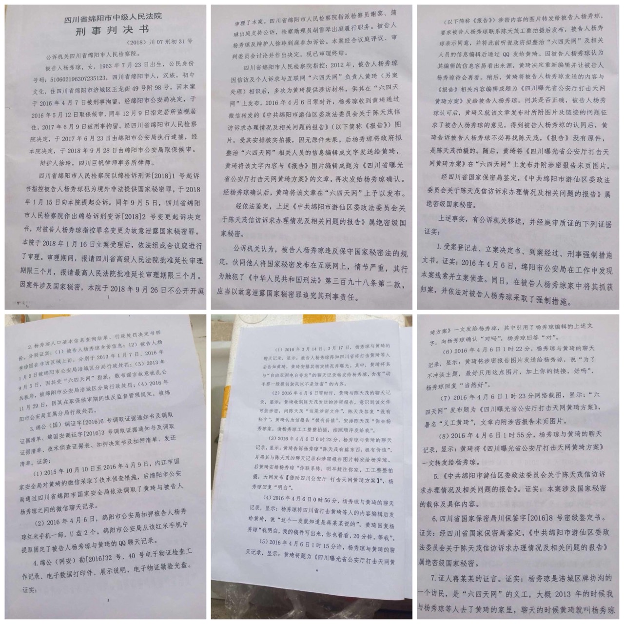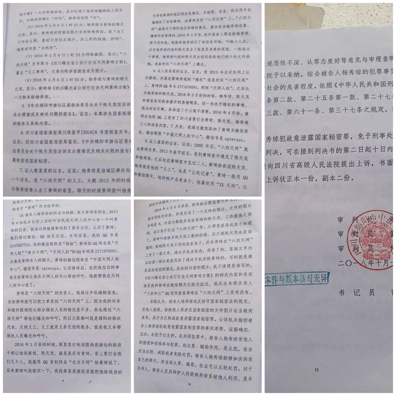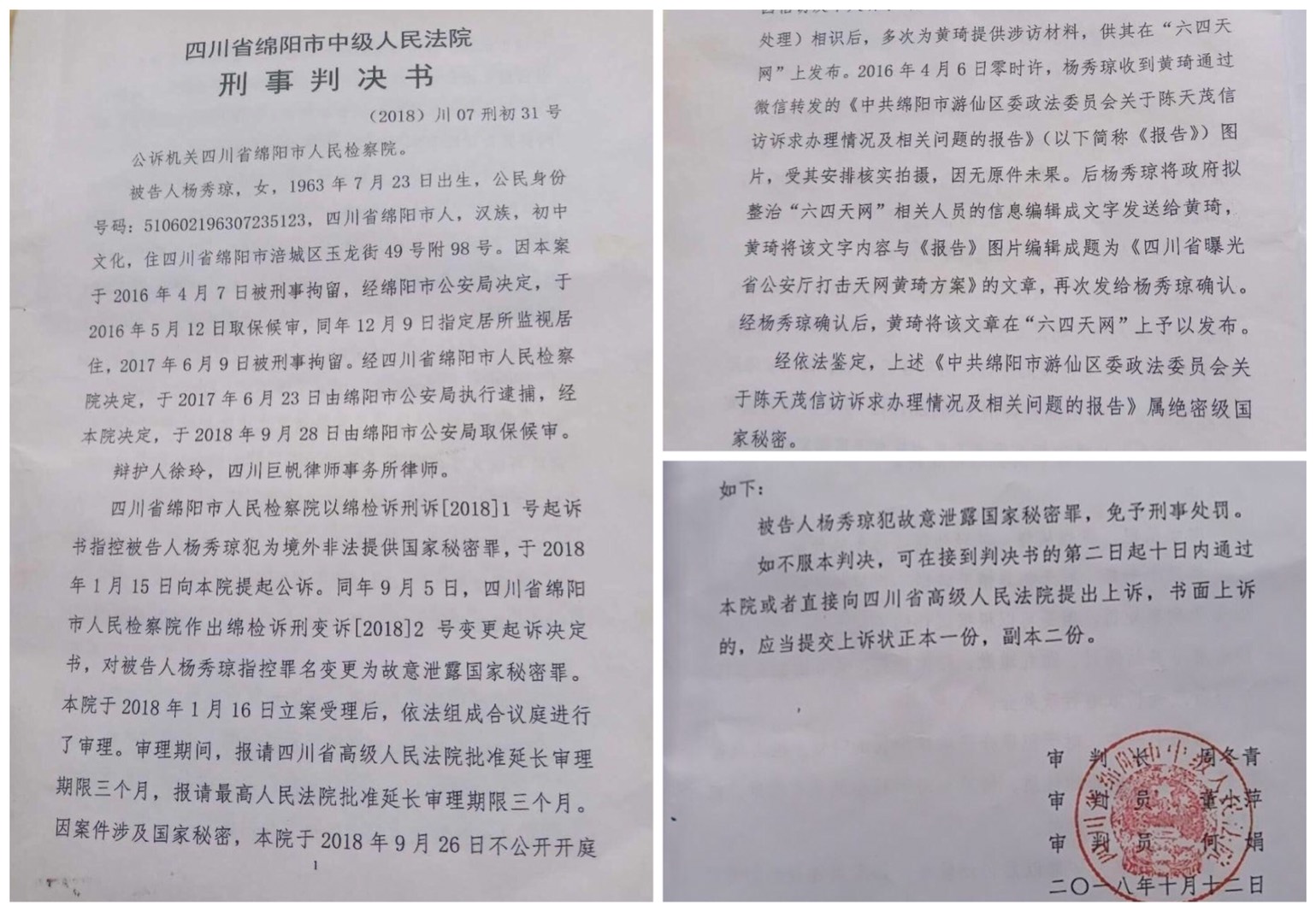 2016年4月,黄琦创办的“六四天网”刊登关于陈天茂的信访报告,半年后,黄琦、陈天茂、杨秀琼三人被抓。四川绵阳当局指控他们“非法为境外提供国家秘密”。