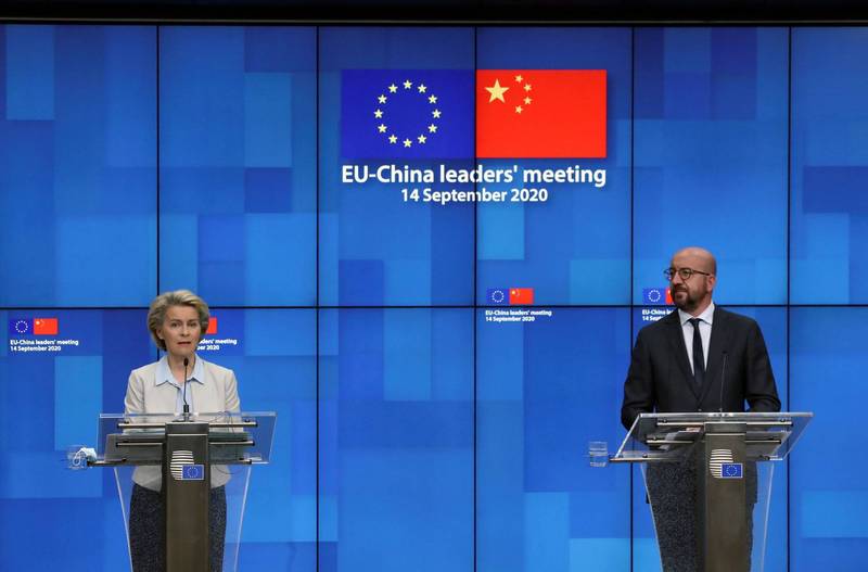 2020/09/15 18:57〔即時新聞/綜合報導〕中歐特別高峰會在昨天(14日)透過視訊進行,由歐盟三巨頭:歐盟輪值主席國德國總理梅克爾(Angela Dorothea Merkel )、歐盟執委會主席馮德萊恩(Ursula von der Leyen)、歐洲理事會主席米歇爾(Charles Michel)與中國國家主席習近平會談;雙方原先目標是在年底前能簽成協商7年多的投資協議,但由於歐盟態度日趨強硬,在中國的人權問題、公平貿易等議題出現分歧,最終2個多小時的會談並沒有達成多少共識,習近平既沒有出席會後記者會,也沒有發表聯合聲明;米歇爾在會後記者會上強調,歐盟「不是競技場」,不會再被利用。